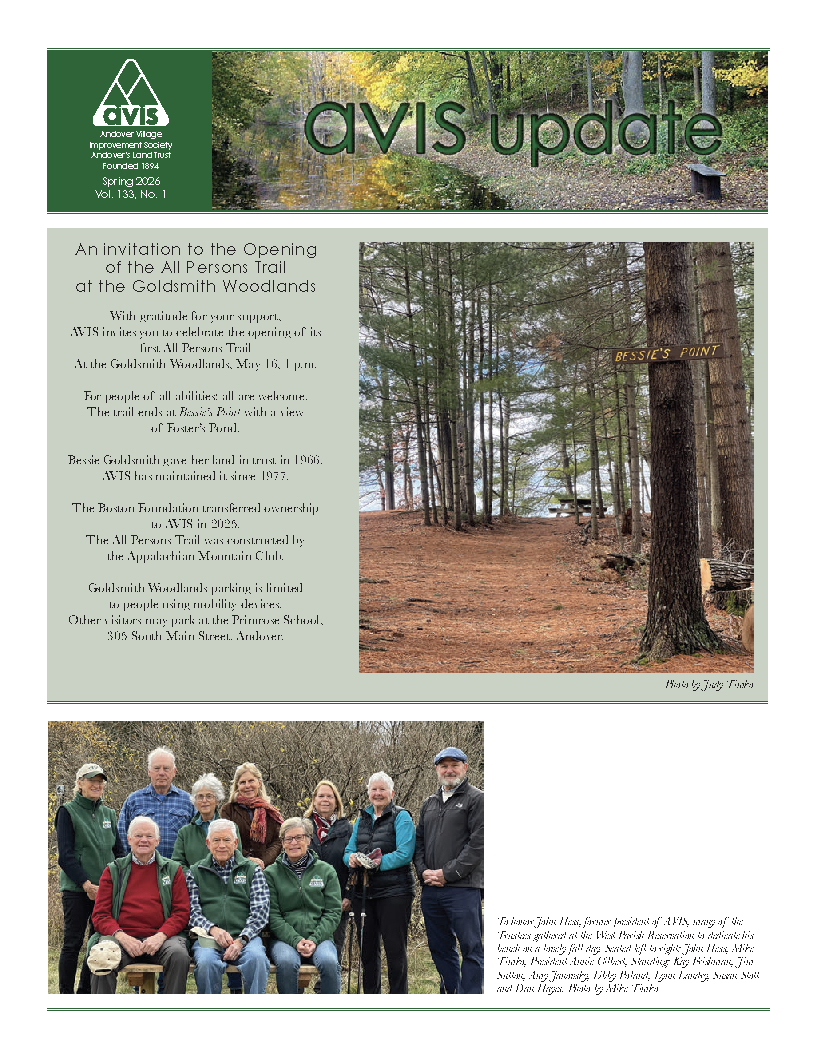 June 17th, 2025: After nearly 50 years of providing careful stewardship of the Goldsmith Woodlands, the Andover Village Improvement Society (AVIS) is now its owner. The deed transferring ownership of the land from The Boston Foundation to AVIS was recorded on May 16th, 2025. (Read More)